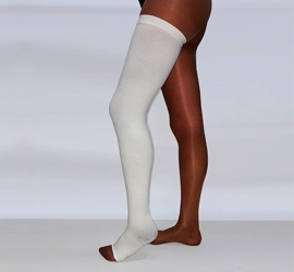 Так как изделие является цельнотканным, нет никаких выступающих швов, которые могли бы передавливать ногу. Чулок отлично держится на ноге за счет мягкой тесьмы.
