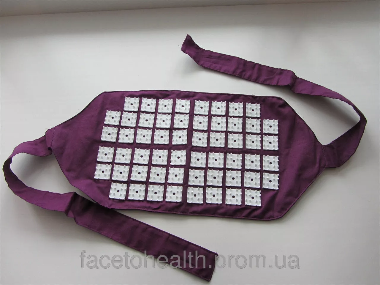 Массажный пояс F 0101 изготовлен из плотной ткани. По центру на широкой части расположены пластмассовые аппликаторы по типу аппликатор Кузнецова квадратной формы. Каждый аппликатор имеет 16 пирамидных иголочек ( 5-8 мм ), которые оказывают рефлекторное воздействие. Благодаря длинным узким частям пояс можно завязывать и фиксировать как на поянице, так и в области других частей тела.